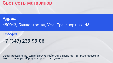 Свет, сеть магазинов по адресу 450043, Башкортостан, Уфа, Транспортная, 46 в дальнейшем Организация, размещена в следующих категориях:
