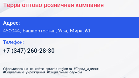 Терра, оптово-розничная компания по адресу 450044, Башкортостан, Уфа, Мира, 61 в дальнейшем Организация, размещена в следующих категориях: