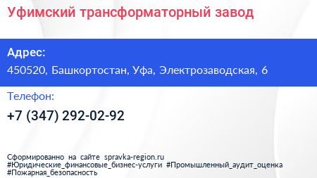 Уфимский трансформаторный завод по адресу 450520, Башкортостан, Уфа, Электрозаводская, 6 в дальнейшем Организация, размещена в следующих категориях: