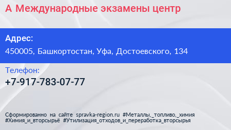 А-Международные экзамены, центр по адресу 450005, Башкортостан, Уфа, Достоевского, 134 в дальнейшем Организация, размещена в следующих категориях: