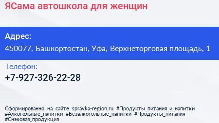 ЯСама, автошкола для женщин по адресу 450077, Башкортостан, Уфа, Верхнеторговая площадь, 1 в дальнейшем Организация, размещена в следующих категориях: