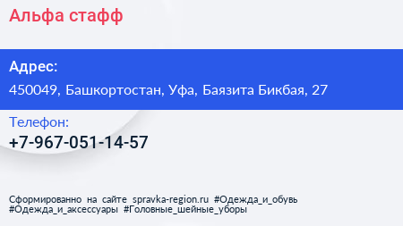 Альфа-стафф по адресу 450049, Башкортостан, Уфа, Баязита Бикбая, 27 в дальнейшем Организация, размещена в следующих категориях: