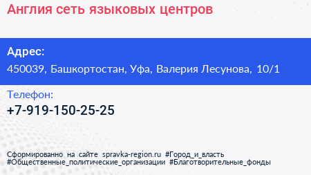 Англия, сеть языковых центров по адресу 450039, Башкортостан, Уфа, Валерия Лесунова, 10/1 в дальнейшем Организация, размещена в следующих категориях: