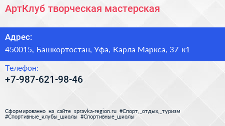 АртКлуб, творческая мастерская по адресу 450015, Башкортостан, Уфа, Карла Маркса, 37 к1 в дальнейшем Организация, размещена в следующих категориях: