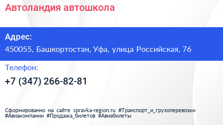 Автоландия, автошкола по адресу 450055, Башкортостан, Уфа, улица Российская, 76 в дальнейшем Организация, размещена в следующих категориях: