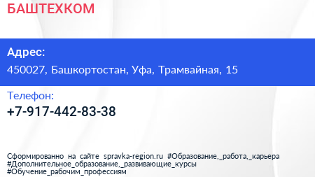 БАШТЕХКОМ по адресу 450027, Башкортостан, Уфа, Трамвайная, 15 в дальнейшем Организация, размещена в следующих категориях: