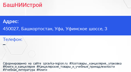 БашНИИстрой по адресу 450027, Башкортостан, Уфа, Уфимское шоссе, 3 в дальнейшем Организация, размещена в следующих категориях: