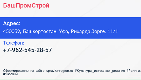 БашПромСтрой по адресу 450059, Башкортостан, Уфа, Рихарда Зорге, 11/1 в дальнейшем Организация, размещена в следующих категориях:
