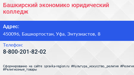 Башкирский экономико-юридический колледж по адресу 450096, Башкортостан, Уфа, Энтузиастов, 8 в дальнейшем Организация, размещена в следующих категориях: