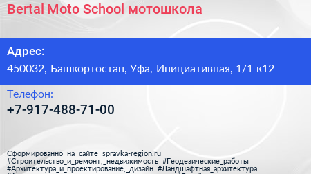 Bertal Moto School, мотошкола по адресу 450032, Башкортостан, Уфа, Инициативная, 1/1 к12 в дальнейшем Организация, размещена в следующих категориях: