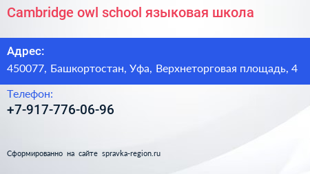 Cambridge owl school, языковая школа по адресу 450077, Башкортостан, Уфа, Верхнеторговая площадь, 4 в дальнейшем Организация, размещена в следующих категориях: