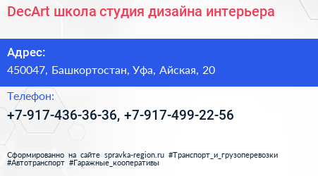 DecArt, школа-студия дизайна интерьера по адресу 450047, Башкортостан, Уфа, Айская, 20 в дальнейшем Организация, размещена в следующих категориях: