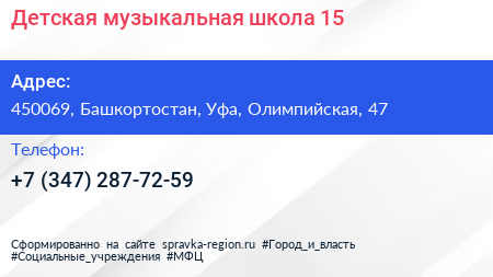 Детская музыкальная школа №15 по адресу 450069, Башкортостан, Уфа, Олимпийская, 47 в дальнейшем Организация, размещена в следующих категориях: