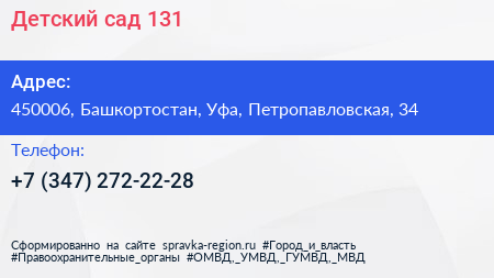 Детский сад №131 по адресу 450006, Башкортостан, Уфа, Петропавловская, 34 в дальнейшем Организация, размещена в следующих категориях: