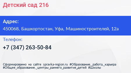 Детский сад №216 по адресу 450068, Башкортостан, Уфа, Машиностроителей, 12а в дальнейшем Организация, размещена в следующих категориях: