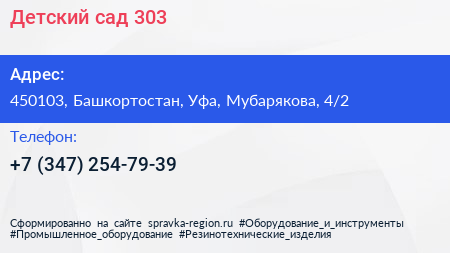 Детский сад №303 по адресу 450103, Башкортостан, Уфа, Мубарякова, 4/2 в дальнейшем Организация, размещена в следующих категориях: