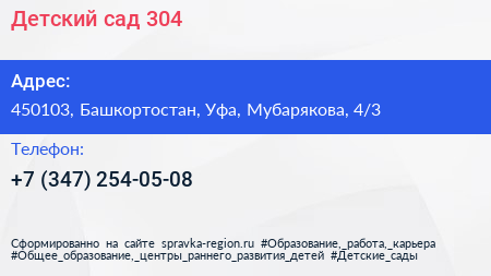 Детский сад №304 по адресу 450103, Башкортостан, Уфа, Мубарякова, 4/3 в дальнейшем Организация, размещена в следующих категориях: