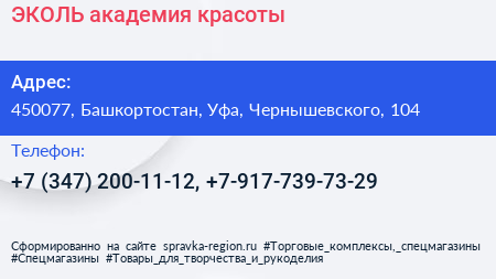 ЭКОЛЬ, академия красоты по адресу 450077, Башкортостан, Уфа, Чернышевского, 104 в дальнейшем Организация, размещена в следующих категориях: