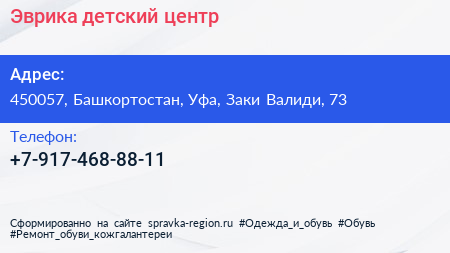 Эврика, детский центр по адресу 450057, Башкортостан, Уфа, Заки Валиди, 73 в дальнейшем Организация, размещена в следующих категориях: