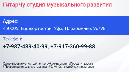 ГитарЧу, студия музыкального развития по адресу 450005, Башкортостан, Уфа, Пархоменко, 96/98 в дальнейшем Организация, размещена в следующих категориях: