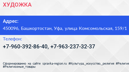 ХУДОЖКА по адресу 450096, Башкортостан, Уфа, улица Комсомольская, 159/1 в дальнейшем Организация, размещена в следующих категориях: