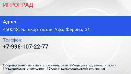 ИГРОГРАД по адресу 450043, Башкортостан, Уфа, Ферина, 31 в дальнейшем Организация, размещена в следующих категориях: