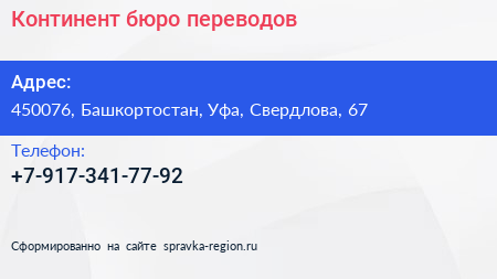 Континент, бюро переводов по адресу 450076, Башкортостан, Уфа, Свердлова, 67 в дальнейшем Организация, размещена в следующих категориях: