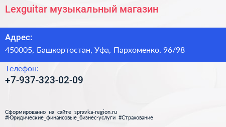 Lexguitar, музыкальный магазин по адресу 450005, Башкортостан, Уфа, Пархоменко, 96/98 в дальнейшем Организация, размещена в следующих категориях: