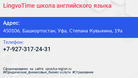 LingvoTime, школа английского языка по адресу 450106, Башкортостан, Уфа, Степана Кувыкина, 19а в дальнейшем Организация, размещена в следующих категориях: