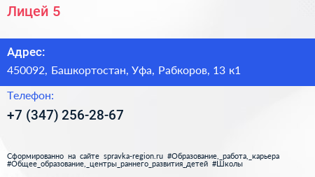 Лицей №5 по адресу 450092, Башкортостан, Уфа, Рабкоров, 13 к1 в дальнейшем Организация, размещена в следующих категориях: