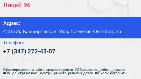 Лицей №96 по адресу 450006, Башкортостан, Уфа, 50-летия Октября, 7а в дальнейшем Организация, размещена в следующих категориях: