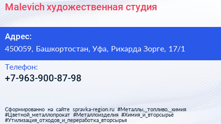 Malevich, художественная студия по адресу 450059, Башкортостан, Уфа, Рихарда Зорге, 17/1 в дальнейшем Организация, размещена в следующих категориях: