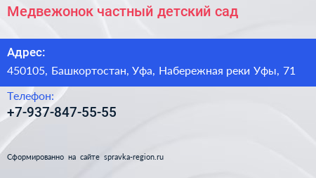 Медвежонок, частный детский сад по адресу 450105, Башкортостан, Уфа, Набережная реки Уфы, 71 в дальнейшем Организация, размещена в следующих категориях: