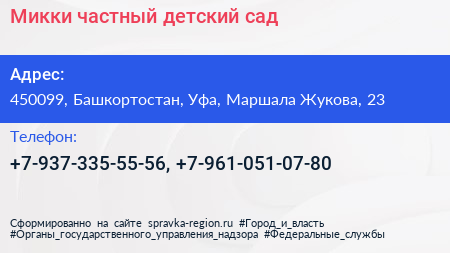 Микки, частный детский сад по адресу 450099, Башкортостан, Уфа, Маршала Жукова, 23 в дальнейшем Организация, размещена в следующих категориях: