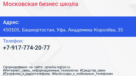 Московская бизнес-школа по адресу 450105, Башкортостан, Уфа, Академика Королёва, 35 в дальнейшем Организация, размещена в следующих категориях: