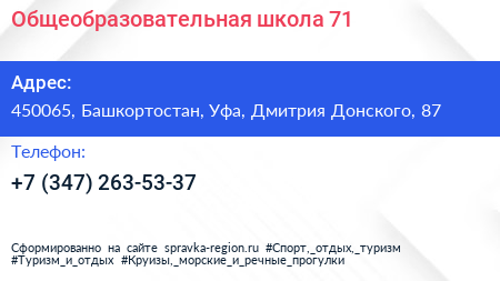 Общеобразовательная школа №71 по адресу 450065, Башкортостан, Уфа, Дмитрия Донского, 87 в дальнейшем Организация, размещена в следующих категориях: