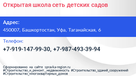 Открытая школа, сеть детских садов по адресу 450007, Башкортостан, Уфа, Таганайская, 6 в дальнейшем Организация, размещена в следующих категориях: