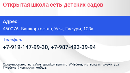 Открытая школа, сеть детских садов по адресу 450076, Башкортостан, Уфа, Гафури, 103а в дальнейшем Организация, размещена в следующих категориях: