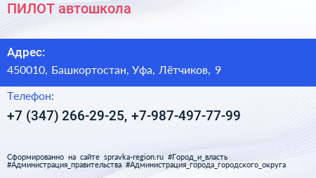 ПИЛОТ, автошкола по адресу 450010, Башкортостан, Уфа, Лётчиков, 9 в дальнейшем Организация, размещена в следующих категориях: