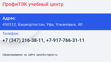 ПрофиТЭК, учебный центр по адресу 450112, Башкортостан, Уфа, Ульяновых, 60 в дальнейшем Организация, размещена в следующих категориях: