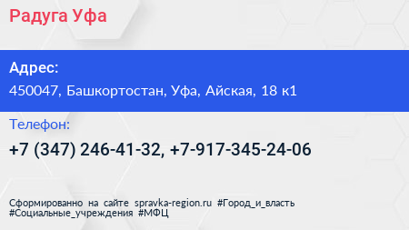 Радуга Уфа по адресу 450047, Башкортостан, Уфа, Айская, 18 к1 в дальнейшем Организация, размещена в следующих категориях: