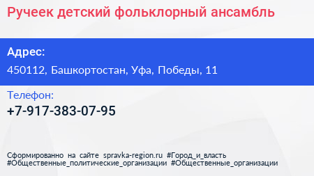 Ручеек, детский фольклорный ансамбль по адресу 450112, Башкортостан, Уфа, Победы, 11 в дальнейшем Организация, размещена в следующих категориях: