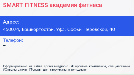 SMART FITNESS, академия фитнеса по адресу 450074, Башкортостан, Уфа, Софьи Перовской, 40 в дальнейшем Организация, размещена в следующих категориях: