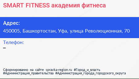 SMART FITNESS, академия фитнеса по адресу 450005, Башкортостан, Уфа, улица Революционная, 70 в дальнейшем Организация, размещена в следующих категориях:
