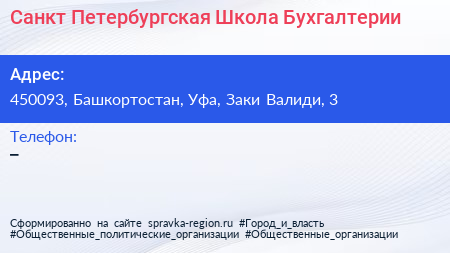 Санкт-Петербургская Школа Бухгалтерии по адресу 450093, Башкортостан, Уфа, Заки Валиди, 3 в дальнейшем Организация, размещена в следующих категориях: