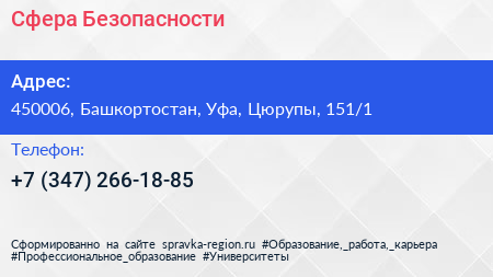 Сфера Безопасности по адресу 450006, Башкортостан, Уфа, Цюрупы, 151/1 в дальнейшем Организация, размещена в следующих категориях: