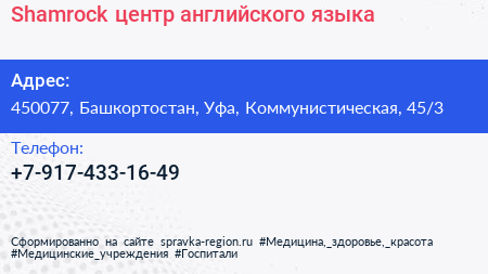 Shamrock, центр английского языка по адресу 450077, Башкортостан, Уфа, Коммунистическая, 45/3 в дальнейшем Организация, размещена в следующих категориях: