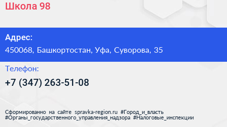 Школа №98 по адресу 450068, Башкортостан, Уфа, Суворова, 35 в дальнейшем Организация, размещена в следующих категориях: