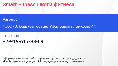 Smart Fitness, школа фитнеса по адресу 450073, Башкортостан, Уфа, Баязита Бикбая, 44 в дальнейшем Организация, размещена в следующих категориях: