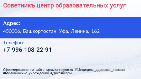 Советникъ, центр образовательных услуг по адресу 450006, Башкортостан, Уфа, Ленина, 162 в дальнейшем Организация, размещена в следующих категориях: